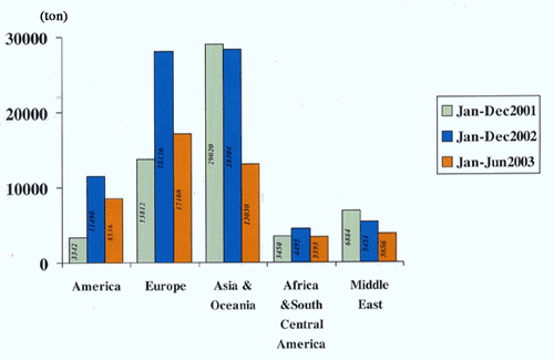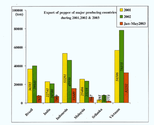 The position of Viet Nam pepper in the world market has been changed due to the good movement of processing and exporting. Export quantity from Viet Nam against main producing countries has been improved 26% in year 2001, 36% in year 2002 and 45% in the first 5 months of year 2003.